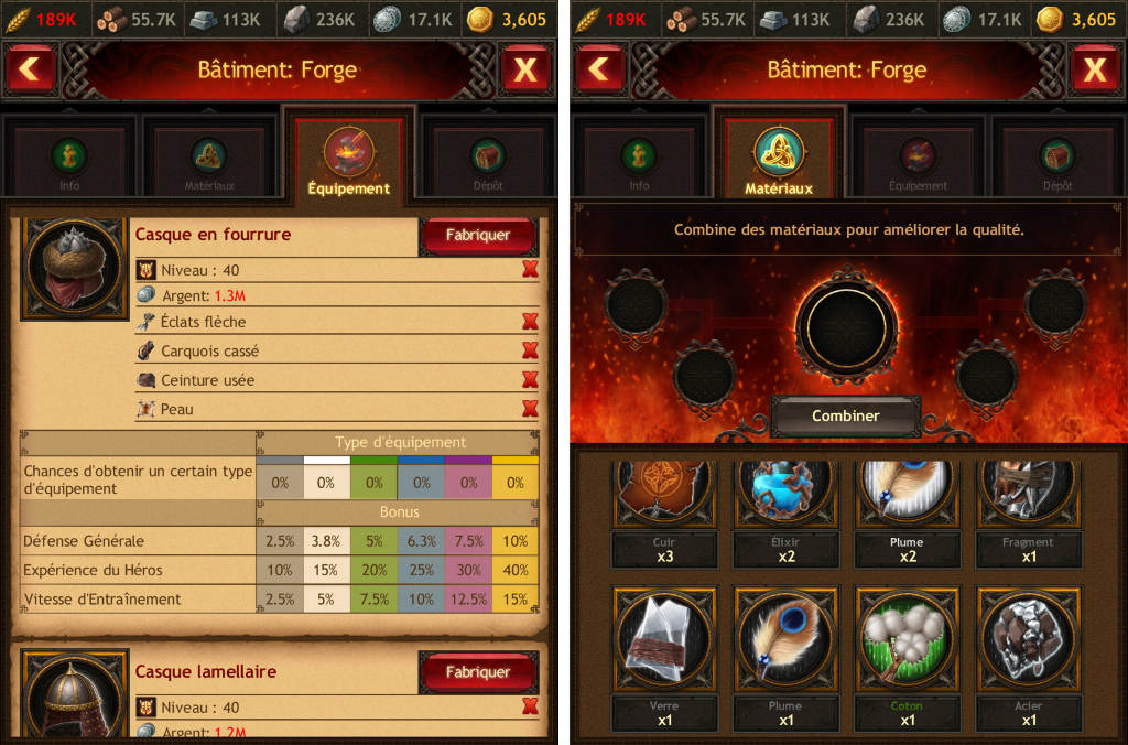 Certaines actions (comme le coffre de Loki, les quêtes et les raids) permettront de récupérer des matériaux spéciaux fort utiles à la fabrication de stuff pour son héros. Bien équipé, celui ci apportera des bonus à sa ville et à ses troupes lors des combats. A ne pas négliger donc. De plus, à mesure que notre héros gagne des niveaux, il sera possible d'attribuer des points de compétences dans les skills de son choix, même si on est amené à monter un peu tout à la fois pour débloquer la compétence qui nous semble la plus intéressante... Un petit coté RPG sympa.